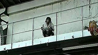 A platinum-blonde female seduced him outdoors and rode his fuckpole in her sexy lingerie