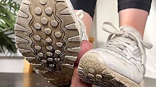 Shoejob and CBT in well worn and dirty Reebok Classic Sneakers - Severe Cock trampling, full body weight, Sneaker fetish and Giantess Views - Tramplegirl Leila crushes the cum out of her slaves...
